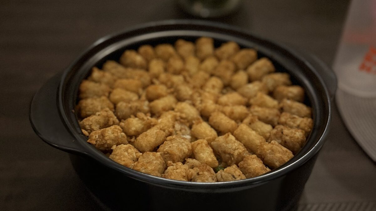 Either way, the casserole is done when the tater tots are dark golden brown and the mixture is hot all the way through.